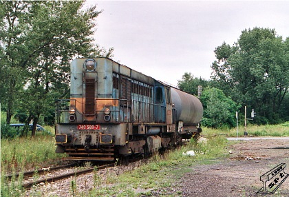 Sune kotlový vůz po vykládce z manipulačního kolejiště Alexander do vlečkové stanice Zárubek (foto Petr Štefek 27.7.2001).