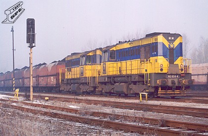 "Dispečer 3" 740.604 + 740.766 v čele uhelného vlaku 436147 Darkov - Nová hu čeká ve stanici Zárubek na rozkaz k odjezdu(foto Petr tefek 25.2.2003).