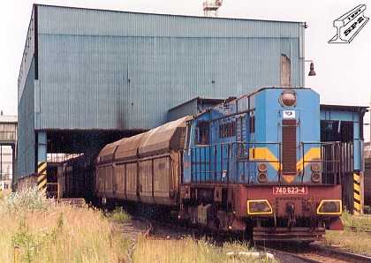 Lokomotiva 740.623 asistuje 3.7.1997 při vykládce uhlí v elektrárně Dětmarovice (archiv OKD, Doprava).