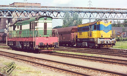 Již v novém "kabátě" a v úpravě na dálkové ovládání se lokomotiva 740.762 setkala na Doubravě se "čmelákem" 770.507 (foto Petr Štefek 12.6.2002).