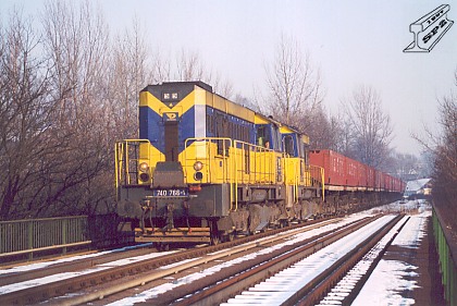 Lokomotivy 740.766 + 740.604 (Dispečer 3) projíždějí v čele vlaku 426547 ÚZK - Nová huť (souprava prázdných vozů LH 40) traťovým úsekem Josefova jáma - Zárubek (foto Petr Štefek 13.2.2003).