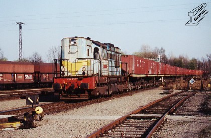 Stroj 740.844-6 na dispečerském výkonu vjíždí do stanice Karviná Doly se soupravou LH vozů se struskou z Třineckých železáren (foto Petr Štefek 4.4.2002).