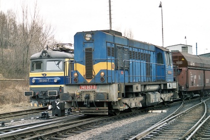 Lokomotiva 740.862 při zatahování soupravy na výsypku v manipulačním kolejišti Odra uhelná služba v Ostravě (foto Petr Štefek 9.3.2001).
