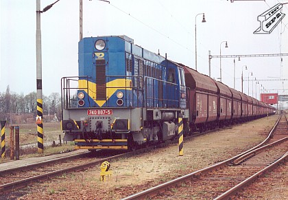 Lokomotiva 740.887 je v kolejišti dolu Mír Mikulčice připravena k odjezdu s uhelným vlakem do elektrárny Hodonín (foto Petr Štefek 12.4.2002).