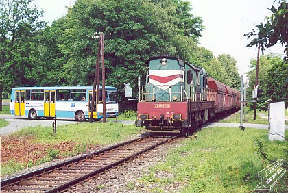 S uhelným vlakem na přejezdu v bývalé zastávky Rychvald (foto Petr Štefek 12.6.2002).
